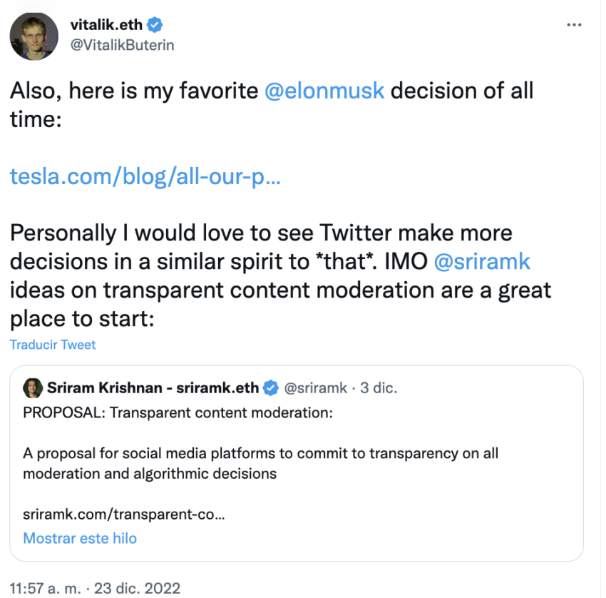 El cofundador de Ethereum también se dijo entusiasta de la noticia que reveló Tesla en 2014, cuando la empresa liberó sus patentes de sus vehículos eléctricos, e incluso sugirió el perfil de Sriram Krishnan para abanderar la tarea de transparencia y moderación de contenidos en Twitter: