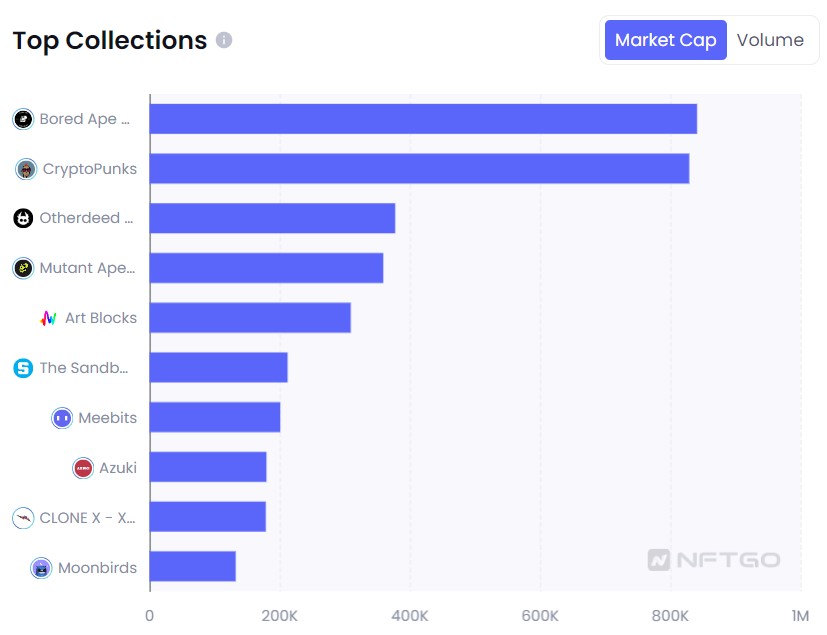 En los últimos siete días, BAYC (8.17%), CryptoPunks (8.05%), Otherdeeds (3.66%) y MAYC (3.49%) fueron los cuatro NFT principales por capitalización de mercado en NFTGo.